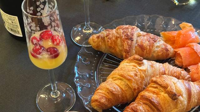 Family-style grazing boards or colourful trays stacked with pastries work great for a relaxed morning spread. Choose things you can prep quickly, and let guests help themselves to make life so much easier. Smoked salmon and croissants feel suitably luxurious and are easy wins.
