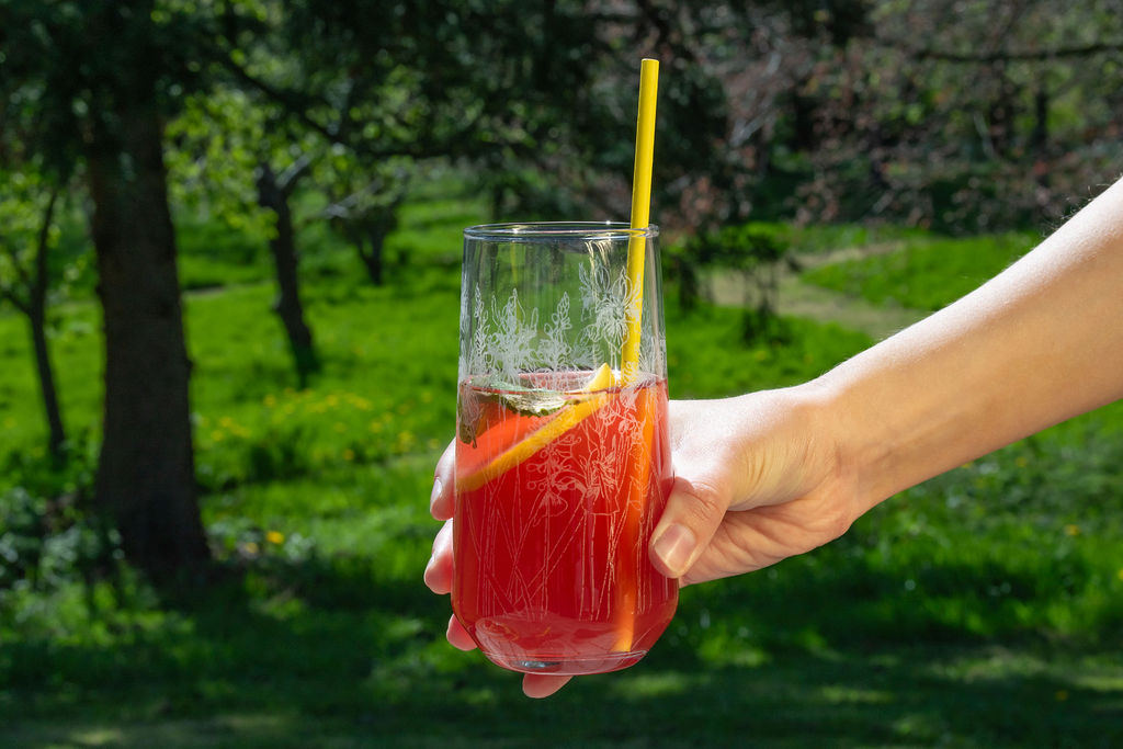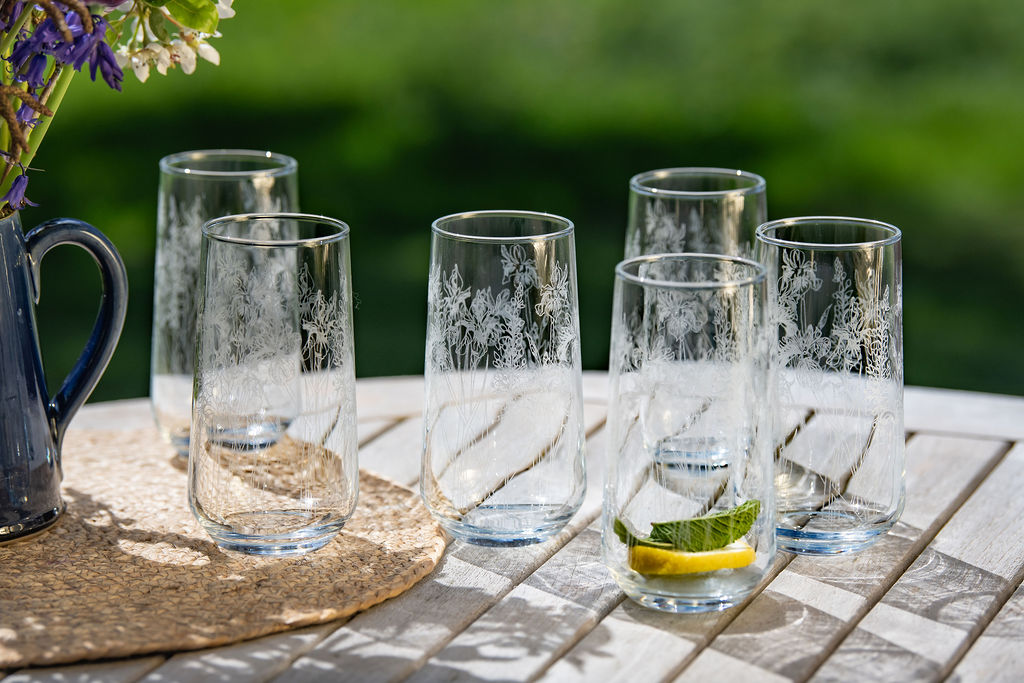Beautifully decorative floral hiball glasses, set of 4. New for 2026, these generously sized tall glasses are perfect for long drinks and summer punches. Featuring Emma’s signature floral glassware pattern, these floral hiball glasses depict irises, foxgloves and lupin flowers.