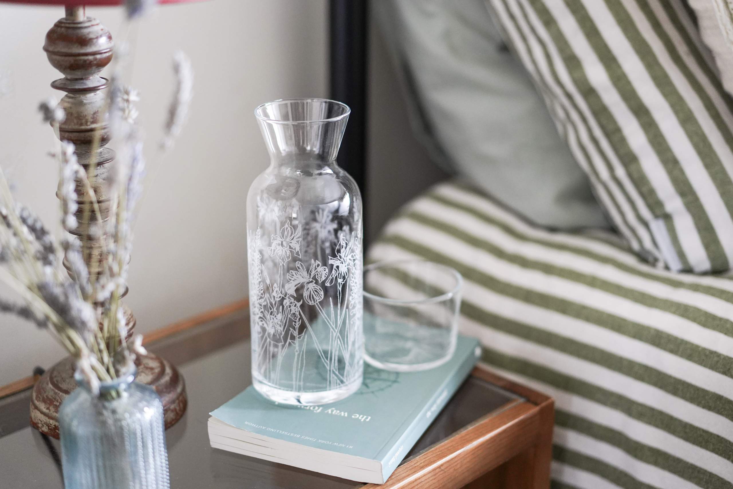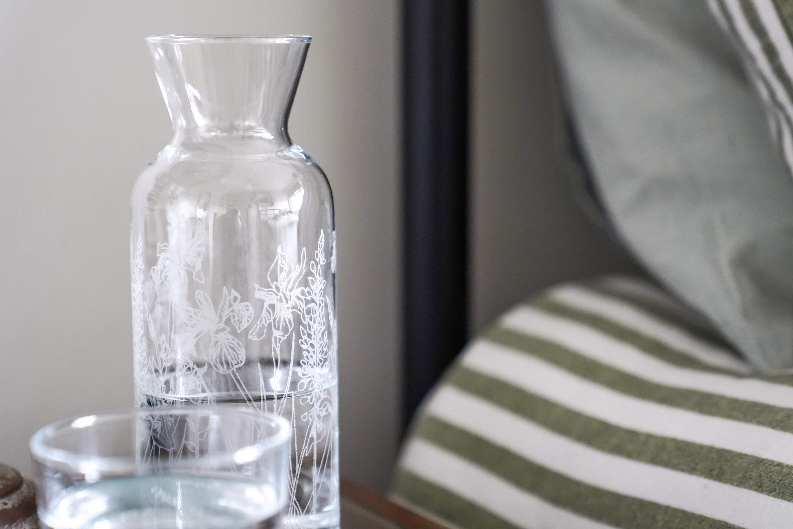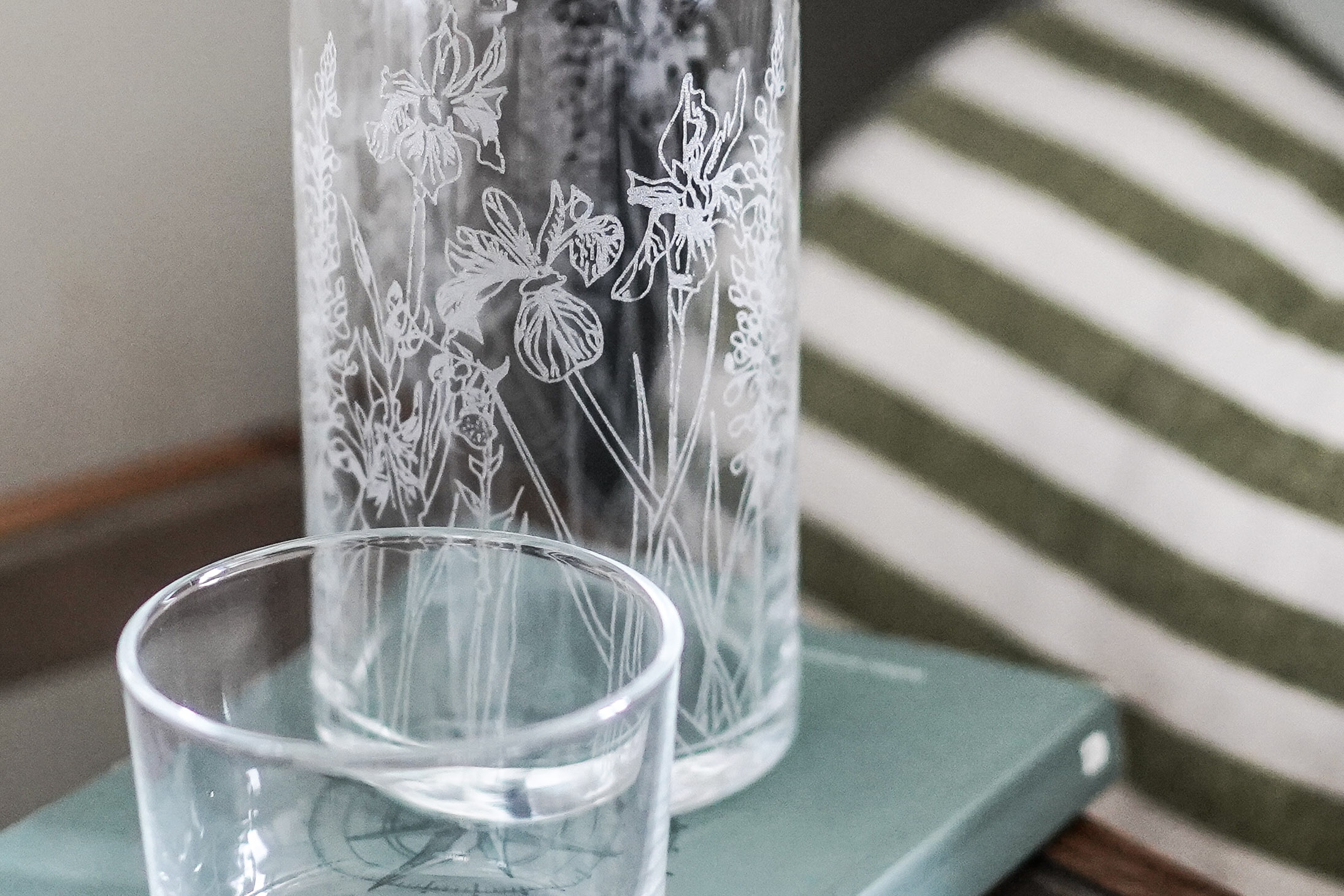 Emma’s Floral glassware pattern features on the Carafe, with a pattern of irises, foxgloves and lupins. Spot an iris flower illustration on the base of the mini tumbler too.