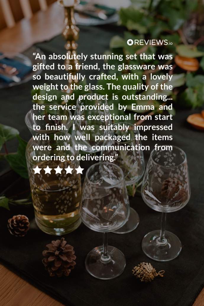 Pretty wine glass gift set of 4 glasses with matching carafe, featuring an etched Silver Birch leaf pattern. This studio decorated and hand-finished glassware features Emma’s popular, dainty and dappled pattern depicting the leaves of much loved Silver Birch trees. The mottled finish gives a soft and elegant effect. Great gift for new homeowners.